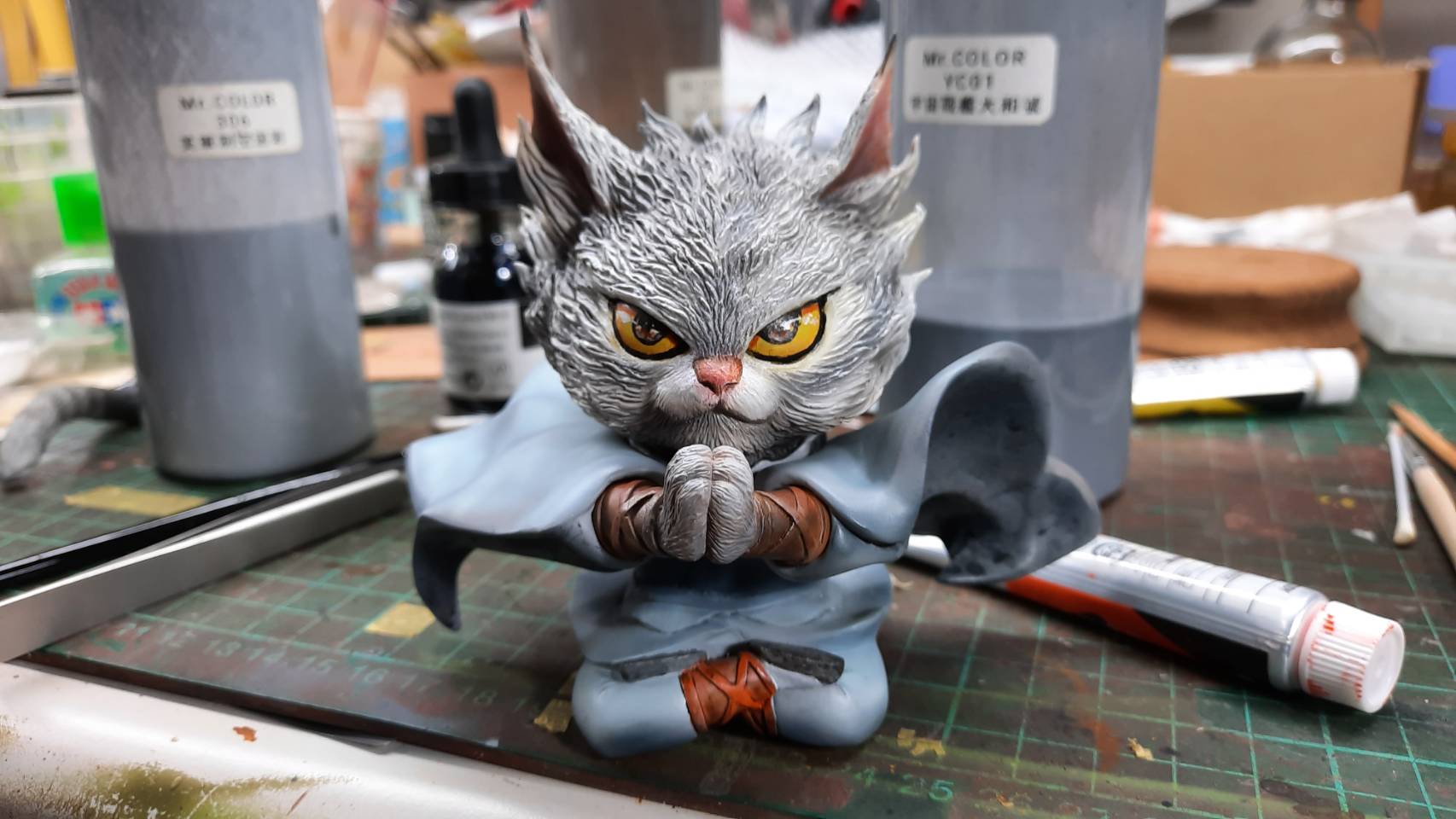 小沈這次受邀與漫畫家朋友合作,進行貓劍客GK白模的塗裝,感到非常高興。